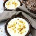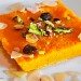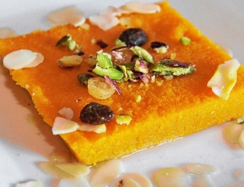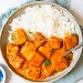 Poulet tikka massala, naan au fromage, halwa (flan de semoule)